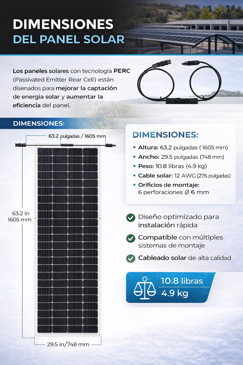 Este panel viene con orificios de montaje preperforados, conectores solares y una caja de conexiones que permite una instalación fácil y rápida.