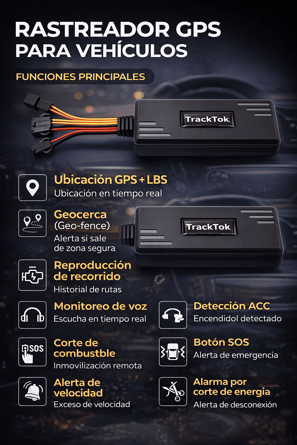Función: Se puede utilizar vehículo/scooter/motocicleta, Seguimiento en tiempo real por SMS/Plataforma/APP, ACC ON/Exceso de velocidad/Alarma de geocerca, Alarma de vibración, Modo de ahorro de energía durante el estacionamiento, Reproducción de historial de seguimiento, Corte remoto de combustible o electricidad, Alarma de corte de energía con batería incorporada, alarma de socorro, Escucha remota de voz